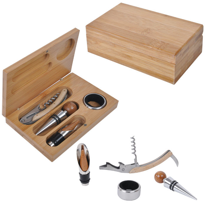 В комплекте: нож сомелье со штопором, пробка, воронка, каплеуловитель Стильный набор для вина в коробочке из бамбука – одного из самых востребованных материалов для кухонных принадлежностей. В комплекте 4 самых необходимых предмета – нож сомелье со штопором, пробка, воронка, каплеуловитель. Благодаря этому благородному комплекту вино будет удобно как открыть, так и хранить, а надежный футляр из натурального материала с гравировкой будет смотреться просто великолепно! Предметы набора безопасны и гигиеничны в использовании, прослужат долго и станут доброй традицией не одного поколения! Достойный и востребованный подарок друзьям, коллегам, партнерам, клиентам, посетителям и гостям.