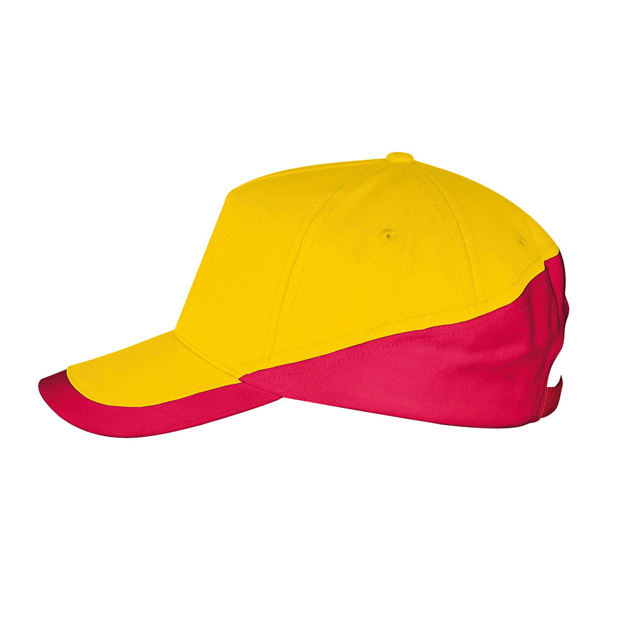 Двухцветная бейсболка BOOSTER без лобового шва с жестким козырьком «сэндвич». 4 обшивных люверса, регулируемая металлическая застежка. Цвет (красный), близкий к PANTONE 200С Цвет (жёлтый), близкий к PANTONE 1225C58 см — минимальный размер, с помощью застёжки его можно увеличить до необходимого.