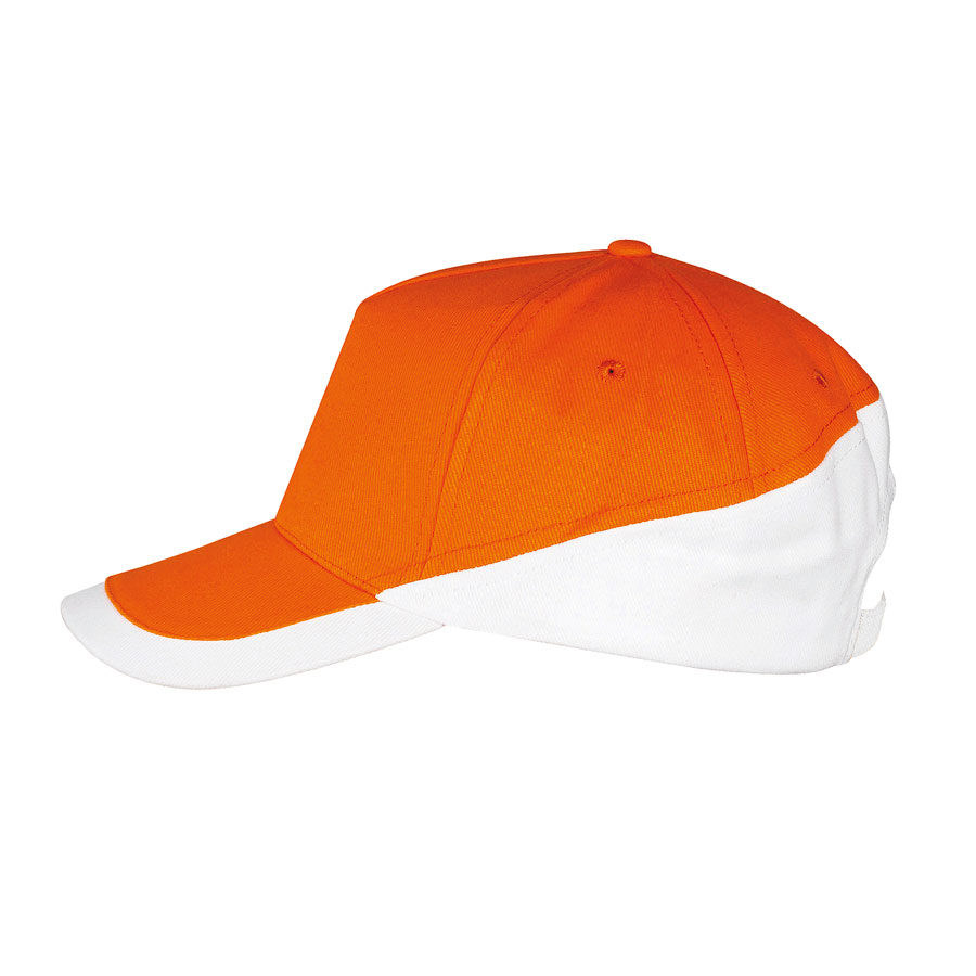 Двухцветная бейсболка BOOSTER без лобового шва с жестким козырьком «сэндвич». 4 обшивных люверса, регулируемая металлическая застежка. Цвет (оранжевый), близкий к PANTONE Orange 021C58 см — минимальный размер, с помощью застёжки его можно увеличить до необходимого.