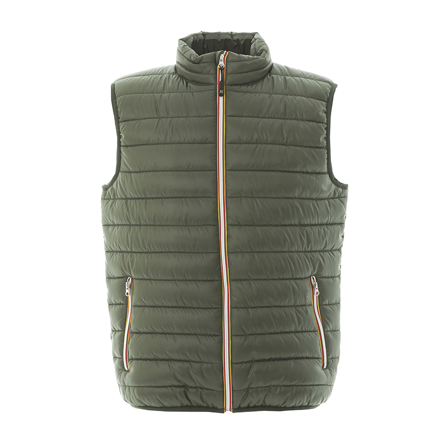 Легкий жилет из нейлона. Небольшой воротник-стойка. Контрастная облегленная пластиковая молния со съемным пуллером. Два передних кармана на молнии. Один внутренний карман на липучке. Cтягивающая эластичная резинка по низу изделия и в рукавах.
