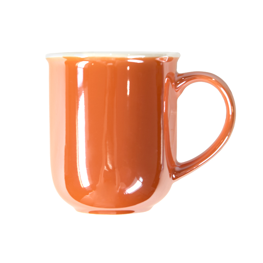 Кружка необычной, скругленной внизу формы, дополнена белым кантом по верхнему краю и актуальным покрытием с жемчужным блеском или эффектом перламутра.