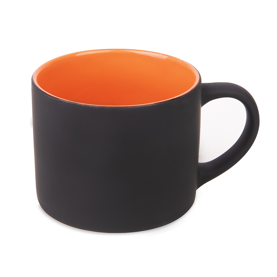 Кружка трендовой цилиндрической формы с черным прорезиненным покрытием.При гравировке подложка вскрывается в цвет внутренней части кружкиЦвет внутренней части близкий к Pantone 165C