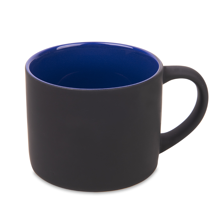 Кружка трендовой цилиндрической формы с черным прорезиненным покрытием.При гравировке подложка вскрывается в цвет внутренней части кружкиЦвет внутренней части близкий к Pantone 2736C