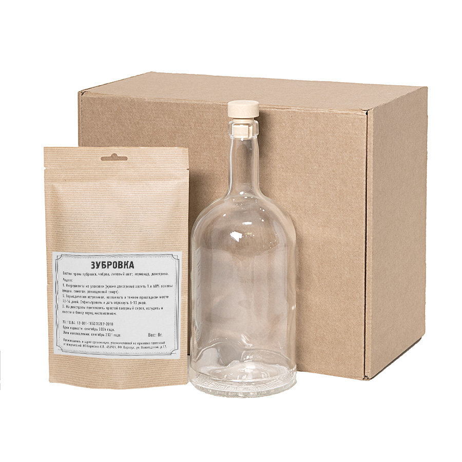 Набор для приготовления 1 литра Зубровки. В состав набора входят: — набор трав и специй «Зубровка» (трава зубровка, чабрец, липовый цвет, кориандр, декстроза), — бутылка 1 л, — пробка Т-образная, — стружка бумажная, — коробка подарочная арт. 34930, размер 30 х 25 х 15 см