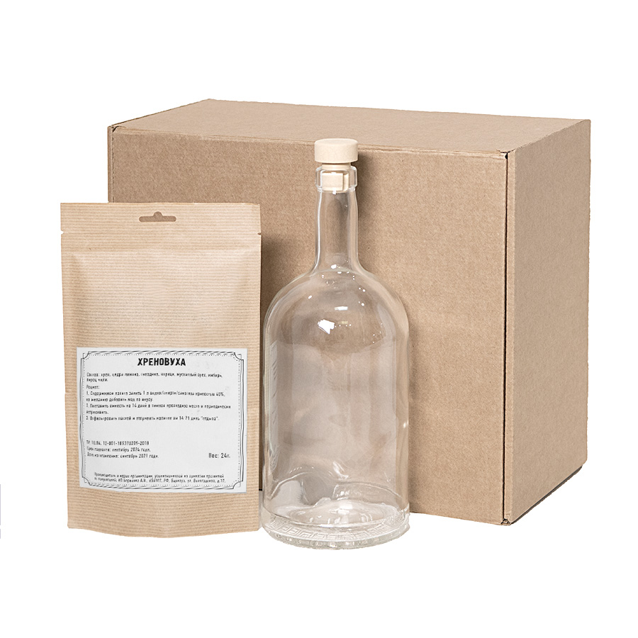 Набор для приготовления 1 литра Хреновухи. В состав набора входят: — набор трав и специй «Хреновуха» (хрен, цедра лимона, гвоздика, корица, мускатный орех, имбирь, перец чили.), — бутылка 1 л, — пробка Т-образная, — стружка бумажная, — коробка подарочная арт. 34930, размер 30 х 25 х 15 см С давних времен известна на Руси настойка на хрене. Еще Петр I в начале XVIII века издал указ, согласно которому в каждом подворье должно быть по 5 четвертей хреновой водки, особенно для тех людей, кто занят тяжёлым трудом и пребывает на холоде.