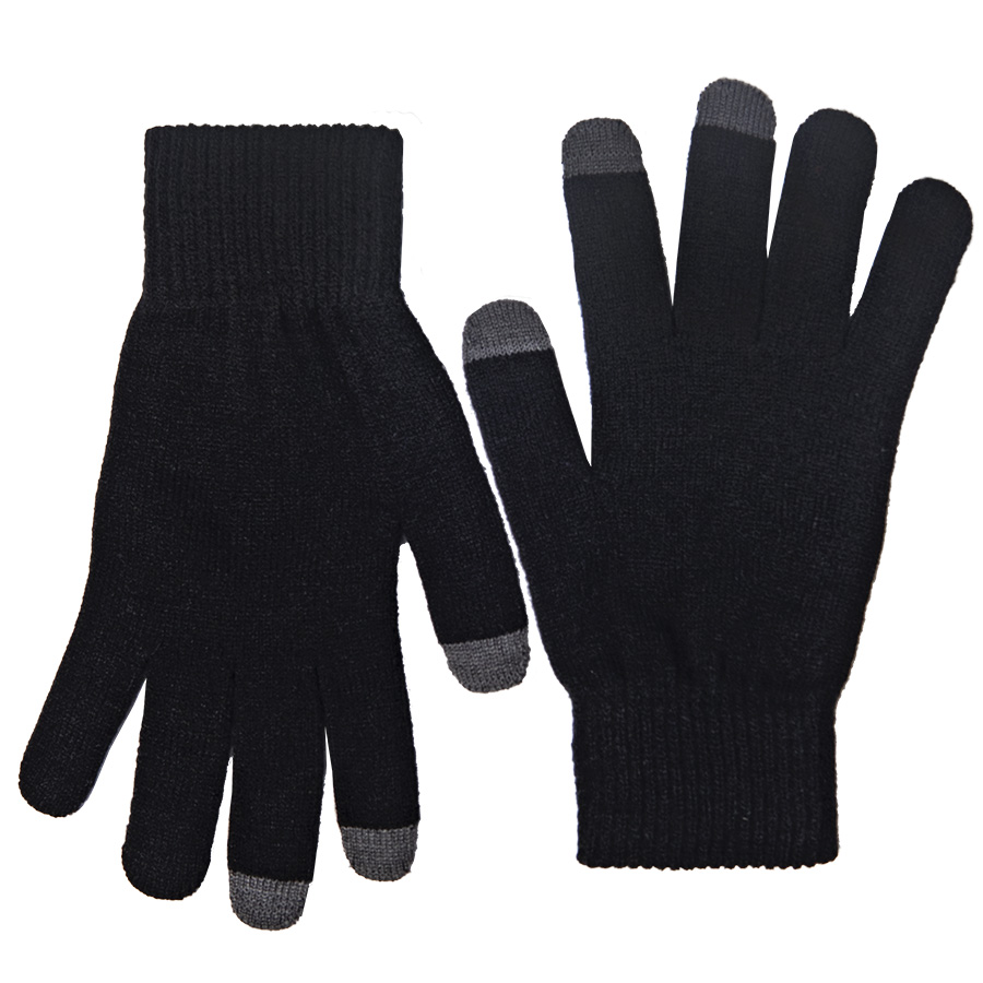 Перчатки из теплого и мягкого акрила с сенсорными наконечниками. Основной цвет: черный. Цвет сенсорных вставок: серый меланж.