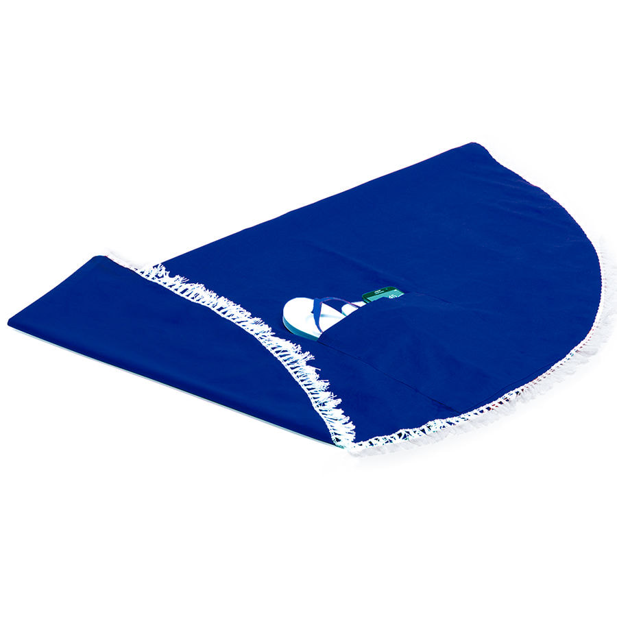 Компактный пляжный коврик из хлопка, удобно взять с собой на пляж. Коврик имеет большой карман для мелочей, по всему периметру бахрома белого цвета. Внимание: коврик в форме круга.