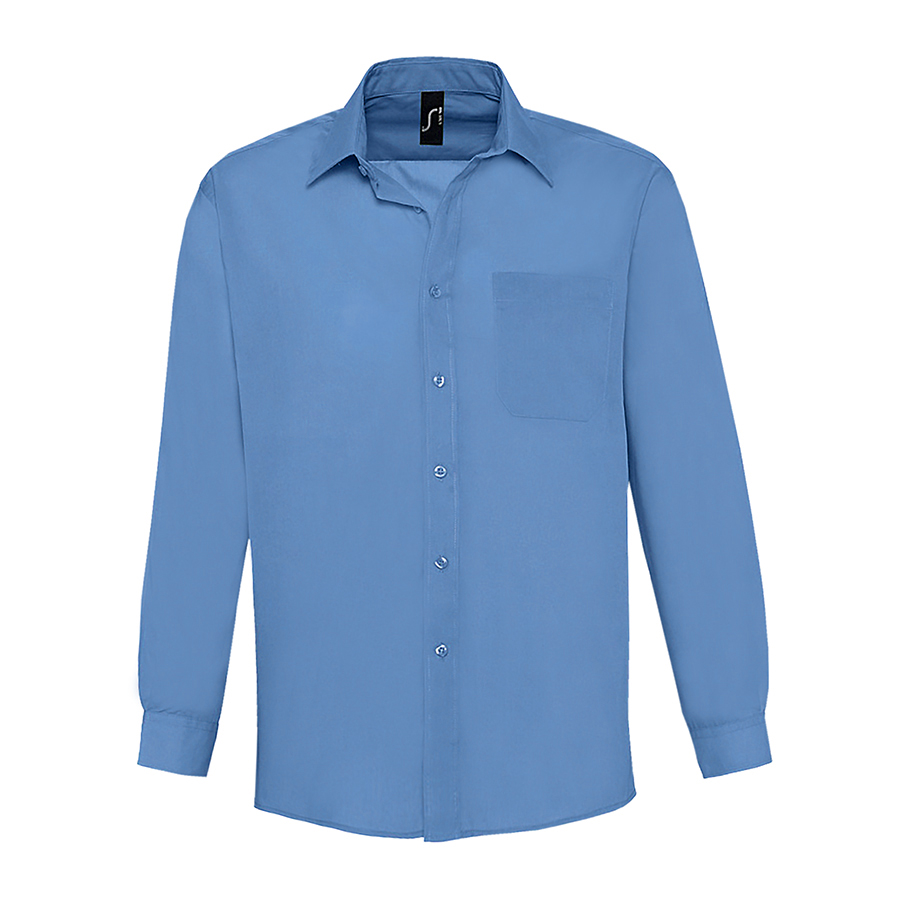 Мужская рубашка из смесового поплина с длинным рукавом. Смесовый поплин обеспечивает максимальный комфорт, лёгок в уход, не мнется. Стандартный крой (прямой). Длинный рукав. Жесткий воротник. Планка с 7 пуговицами в цвет изделия. Нагрудный карман слева. Цвет близкий к PANTONE 7454C