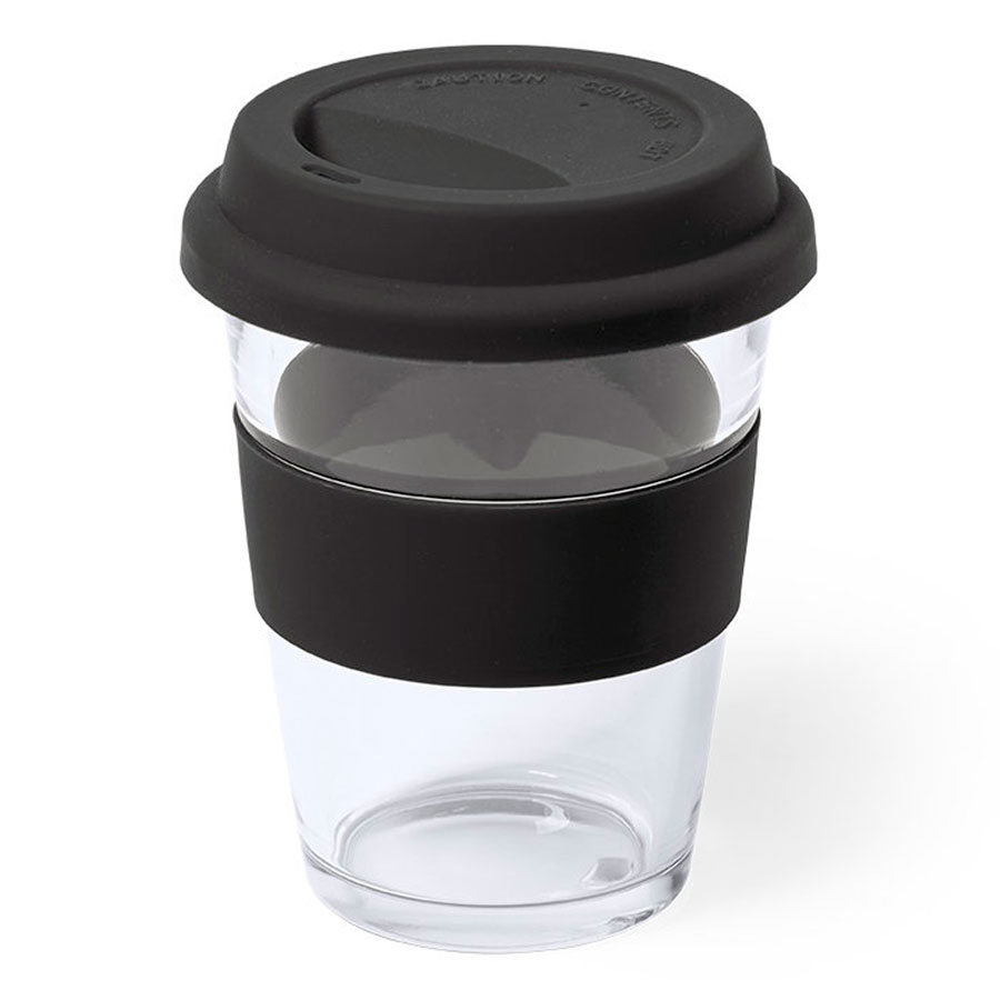 Стеклянный стакан с цветной силиконовой крышкой и манжетой. Манжета обеспечивает безопасность ваших рук при использовании стакана для горячих напитков. Индивидуальная упаковка — белая картонная коробка с изображением продукта.