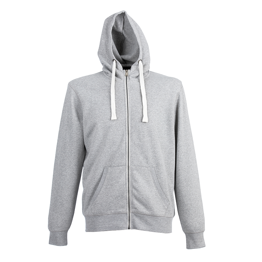 Толстовка с эффектом «меланж». Облегченная пластиковая молния с контрастной тканевой лентой. Капюшон с небольшой стойкой и плоским вытяжным шнуром. Манжеты и низ изделия обработаны рибом 1*1.