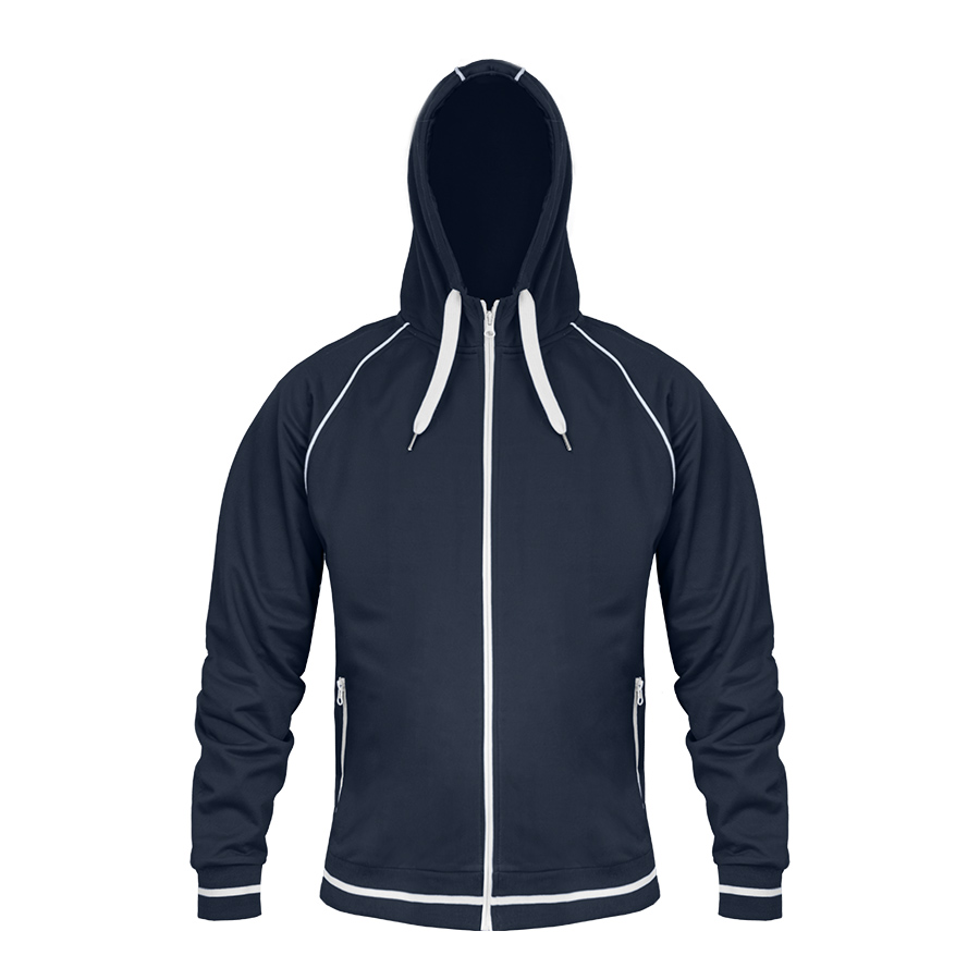 Основная ткань: цвет, близкий к Pantone 296 C Толстовка из полотна «пике» с водоотталкивающей пропиткой. Обратные контрастные молнии для предотвращения попадания влаги внутрь. Рукава-реглан. Декоративная тесьма по горловине спинки. Капюшон на подкладке с небольшой стойкой. Контрастные канты и шнур в капюшоне. Два передних кармана на молнии. Манжеты и низ изделия обработаны плотным рибом 1*1 .