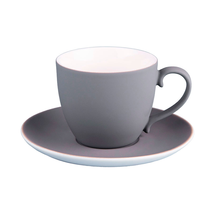 Чайная пара из фарфора с прорезиненным покрытием soft-touchЧашка классической формы и удобное глубокое блюдцеЦвет близкий к Pantone 2333C