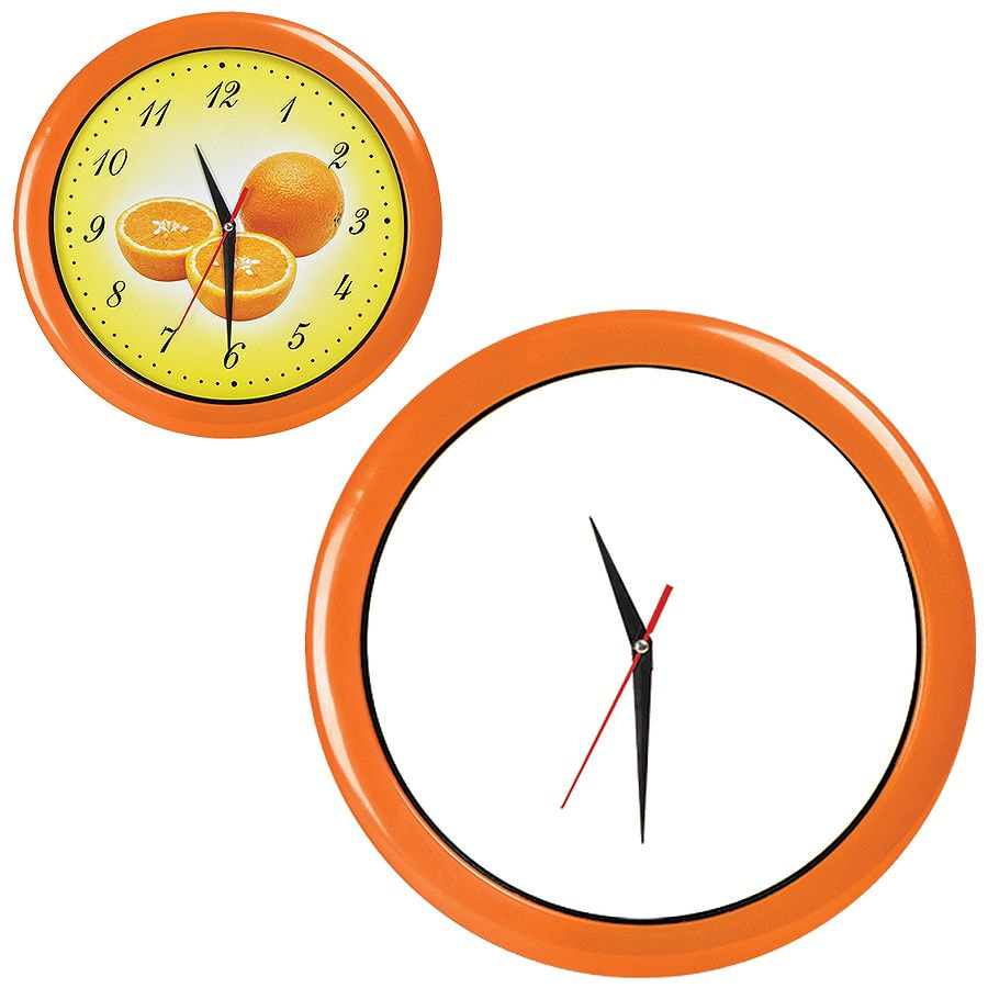 Pantone 151C Часы настенные с кварцевым механизмом, работают от 1 батарейки АА. Предназначены для вставки циферблата с печатью по индивидуальному дизайну Комплектация: 1) корпус с часовым механизмом, 2) минеральное стекло, 3) ободок, 4) стрелки — 3 шт. (часовая и минутная стрелки — черного цвета, секундная — красного цвета). Для удобства вставки циферблата с печатью по индивидуальному дизайну, стрелки часов не зафиксированы и поставляются в отдельном пакетике) 5) Муляж циферблата (диаметр 235 мм) Для вставки используется мелованная бумага матовая 300 гр.